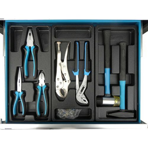 Pátý zásuvka o rozměrech 53 cm x 5,5 cm x 45 cm obsahuje 5 ks kleští, kladivo a paličku.