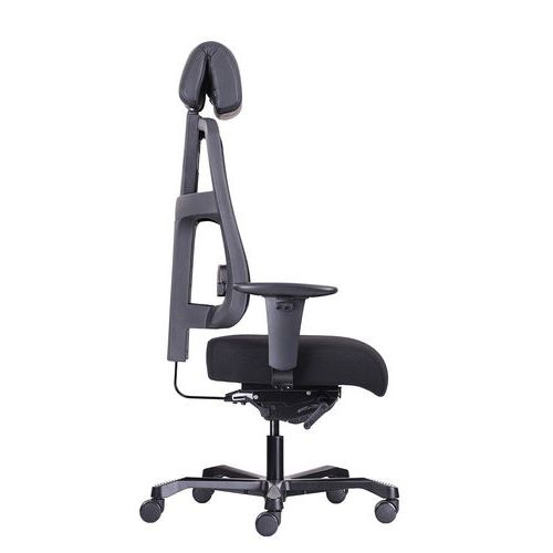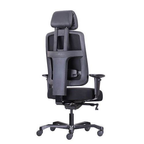- Extra vysoký výškově stavitelný zádový opěrák, který je ze zadní strany potažen černou síťovinou a z opěrné části čalouněn černou potahovou látkou.