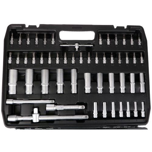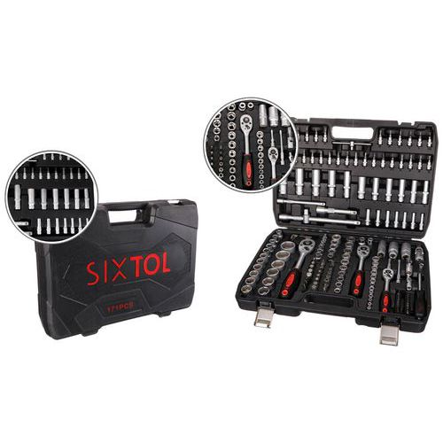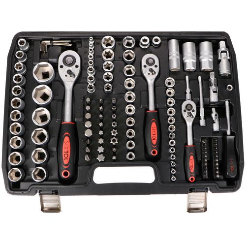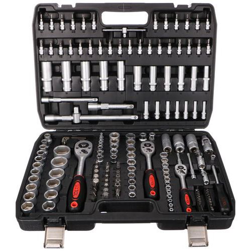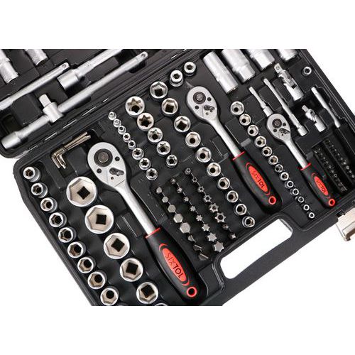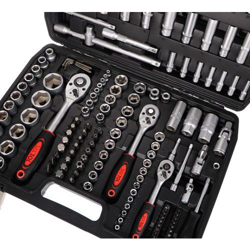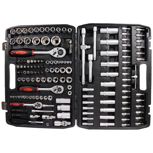 Součásti balení je 13ks 1/4 nástrčné hlavice 4, 4,5, 5, 5,5, 6, 7, 8, 9, 10, 11, 12, 13, 14MM, 7ks 1/4 trubkové nástrčné hlavice 4, 5, 6, 7, 8, 9, 10MM, 2ks 1/2 prodlužovací nástavec k nástrčným hlavicím 5 a 10, 1ks 1/4 rukojeť šroubováku 6, 20ks bitů T8, 9, 10, 15, 20, 25, 30 H3, 4, 5, TT8, 9, 10, 15, 20, 25, 30, SL4, 5,5, 7, 30ks 1/4 zástrčné klíče H2, 3, 4, 5, 6, FD4, 5,5, 7, PH1, 2, 3, PZ1, 2, 3, T8, 9, 10, 15, 20, 25, 27, 30, TT8, 9, 10, 15, 20, 25, 27, 30, 6ks 3/8 nástrčné hlavice torx E10, E11, E12, E14, E16, E18, 1ks 3/8 nástrčný klíč na zapalovací svíčky 21mm, 17ks 1/2 nástrčné hlavice 10, 11, 12, 13, 14, 15, 16, 17, 18, 19, 20, 21, 22, 24, 27, 30, 32MM, 5ks 1/2 trubkové nástrčné hlavice 16, 17, 18, 19, 22MM, 7ks l-imbusový klíč 1, 1,5, 2, 2,5, 3, 4, 5MM, 3ks 3/8, 1/4 a 1/2 ráčna s rukojetí, 2ks 3/8 a 1/2 adaptér na bity, 24ks (8mm) bitů H7, 8, 10, 12, 14, FD8, 10, 12, PH3, 4, PZ3, 4, T40, 45, 50, 55, 60, 70, TT40, 45, 50, 55, 60, 70MM, 1ks 3stranný adaptér, 1ks kufr