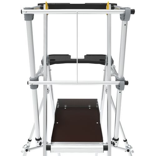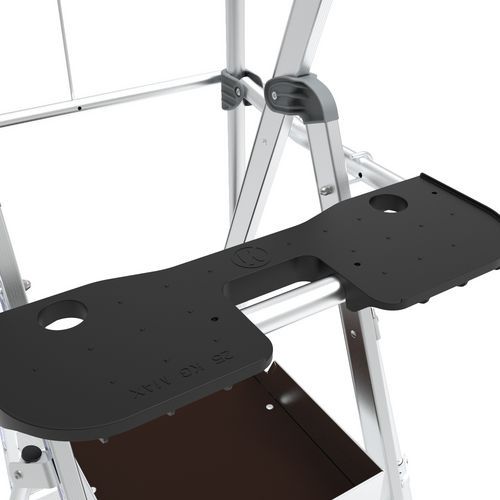 Pracovní plošiny Sherpamatic. Pevné 4stranné zábradlí s poloautomatickým zavíráním zadních zábradlí proti pádu. Protiskluzové schůdky 80 mm. Odnímatelný přihrádkový držák nářadí s nosností 25 kg, s integrovanými háčky (max. 10 kg). Výsuvné stabilizátory s milimetrovým nastavením. Vysoce komfortní protiskluzová podlaha 590 x 400 mm. Ergonomický a pohodlný pracovní prostor. Terénní pojezdová kola Ø175 mm. Max. zatížení (kg) : 150