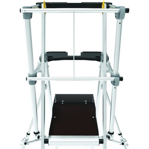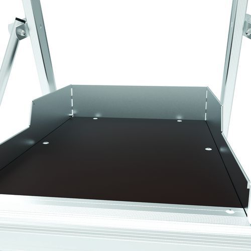 Pracovní plošiny Sherpamatic. Pevné 4stranné zábradlí s poloautomatickým zavíráním zadních zábradlí proti pádu. Protiskluzové schůdky 80 mm. Odnímatelný přihrádkový držák nářadí s nosností 25 kg, s integrovanými háčky (max. 10 kg). Výsuvné stabilizátory s milimetrovým nastavením. Vysoce komfortní protiskluzová podlaha 590 x 400 mm. Ergonomický a pohodlný pracovní prostor. Terénní pojezdová kola Ø175 mm. Max. zatížení (kg) : 150 kg