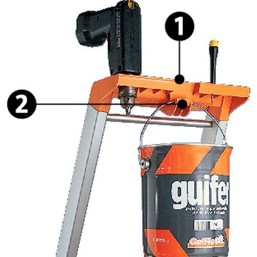- Součástí je držák na nářadí s hákem na kbelík a uzavíratelná přihrádka na šrouby.
