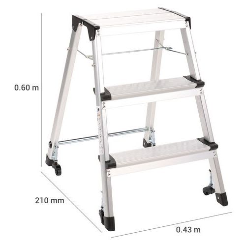 Skládací hliníkové stupátko se dvěma schůdky. Žebrované protiskluzové schůdky pro pohodlí uživatele. Snadno se přemisťuje díky čtyřem samonavíjecím kolečkům.