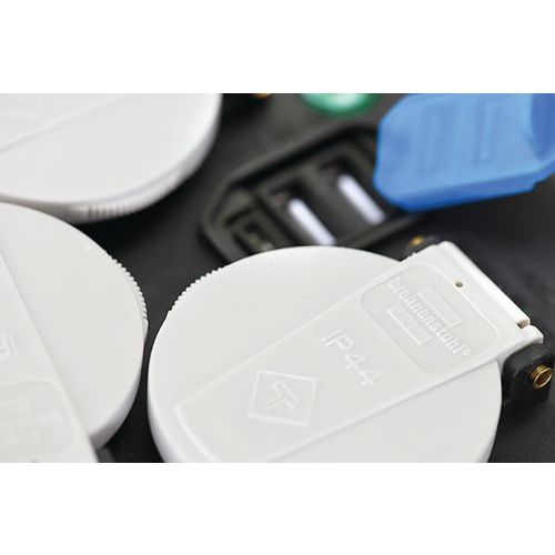 - Plastová/gumová základna, LED indikátor přítomnosti napětí, 2 USB zásuvky s krytkou a tepelnou pojistkou.
