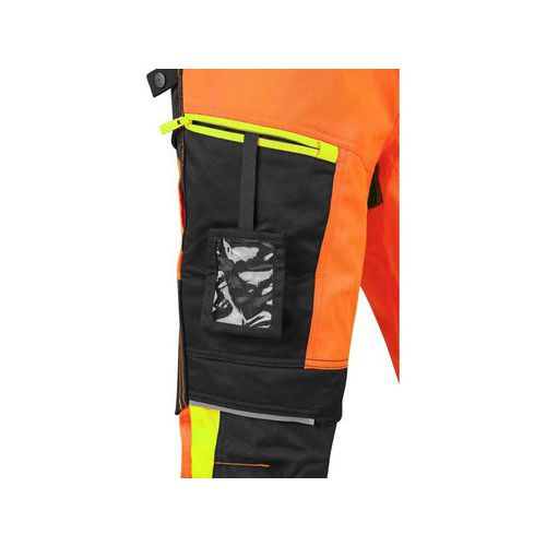 Pánské výstražné kalhoty, pas s poutky na opasek a gumou v bocích, 2 přední kapsy, 2 zadní kapsy, jedna s klopou, kryté přední zapínání na zip, boční multifunkční kapsy, stehenní zipová kapsa s vnitřním pouzdrem na ID kartu, kolena zesílena materiálem CORDURA s možností vložení kolenních výztuh, spodní část nohavic vyztužena materiálem CORDURA, segmentované reflexní pásky (šíře 7 cm), kontrastní žluté/oranžové a reflexní doplňky. Doporučené použití: stavebnictví, silničáři, údržba, logistika, letecká a lodní doprava. Velikost: 48-60 Svrchní materiál: Základní materiál: satén 60 % bavlna 40 % polyester, Doplňkový materiál: kepr 60 % bavlna 40 % polyester Reflexní doplňky: Ano OEKO-TEX® STANDARD 100: Ano
