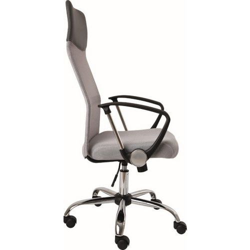 Multifunkční kancelářská židle s houpacím mechanismem. Síťovaný opěrák zajišťuje pohodlí v letních měsících. Židle disponuje opěrkou hlavy a bederní páteře. Výška sedáku se reguluje pomocí plynového pístu. Stabilitu kolečkové židle zajišťuje chromovaný kříž.