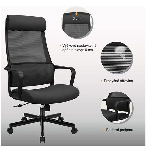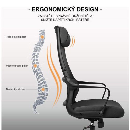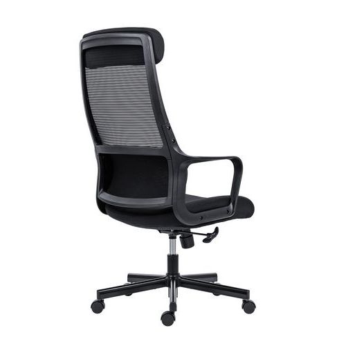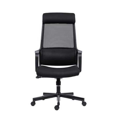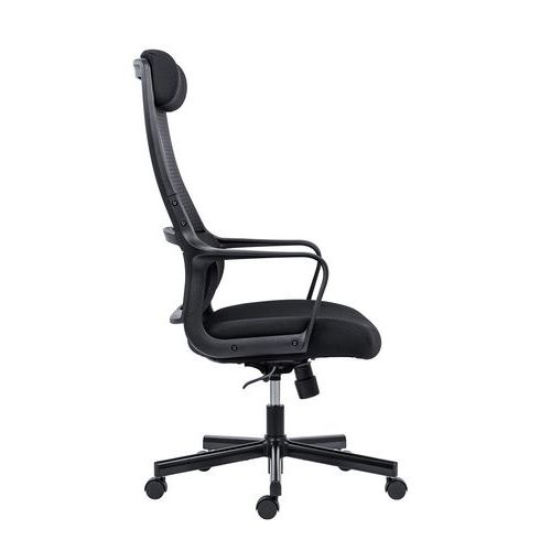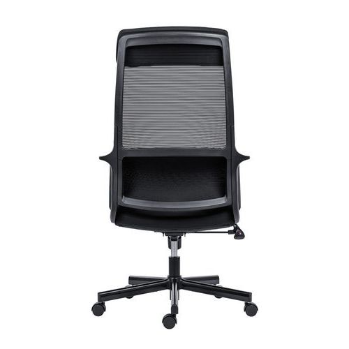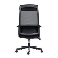 - Kancelářská židle Faro s vysokým prodyšným opěrákem potaženým černou síťovinou.