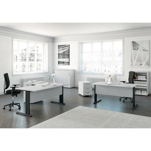 - Psací stoly Manutan Expert s deskou z melaminového panelu v šedém provedení o tloušťce 25 mm.