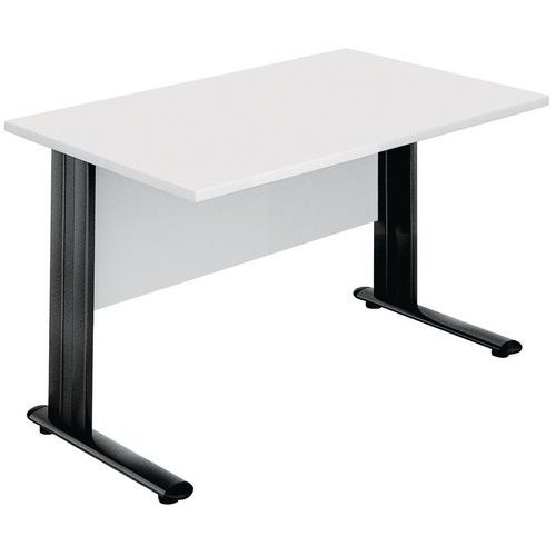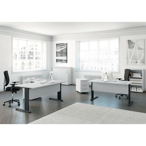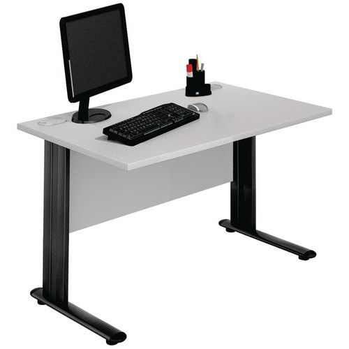 - Kancelářské stoly ve světle šedém provedení s deskou z melaminových panelů o tloušťce 25 mm.