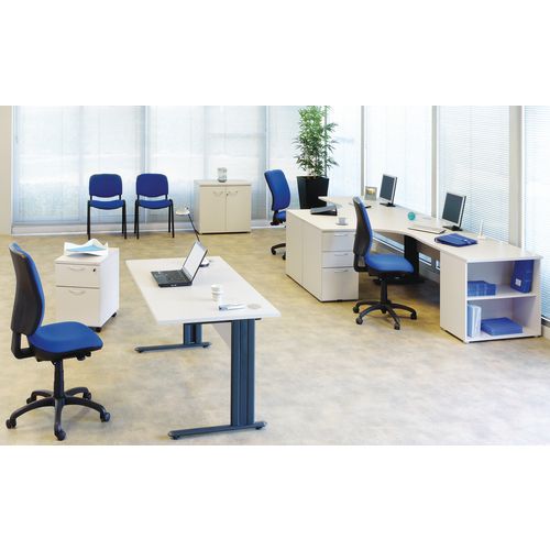 - Kancelářské stoly ve světle šedém provedení s deskou z melaminových panelů o tloušťce 25 mm.