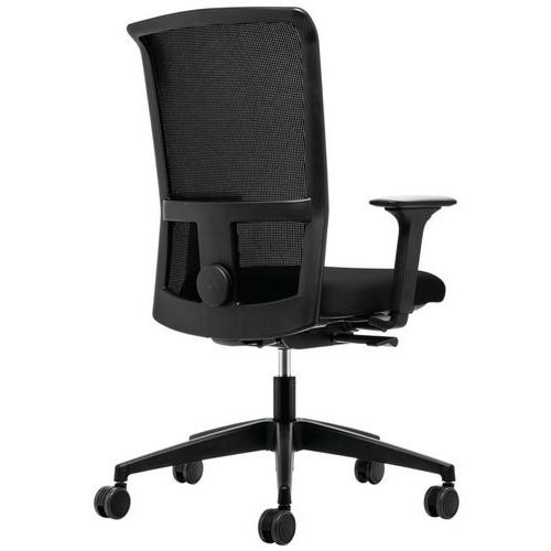 Otočná kancelářská židle s vysokým polstrovaným opěradlem, které lze aretovat v přední i zadní poloze.