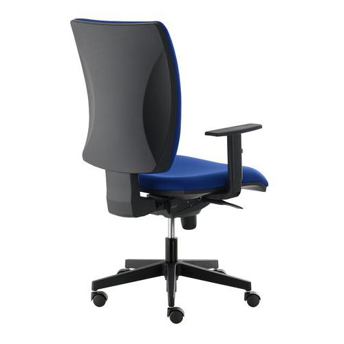 Čalouněné otočné židle do kanceláří či domácích pracoven v antracitové a tmavě modré barvě. Pohodlnost sezení této židle u PC zajišťuje synchronní mechanika a výškově stavitelné područky.