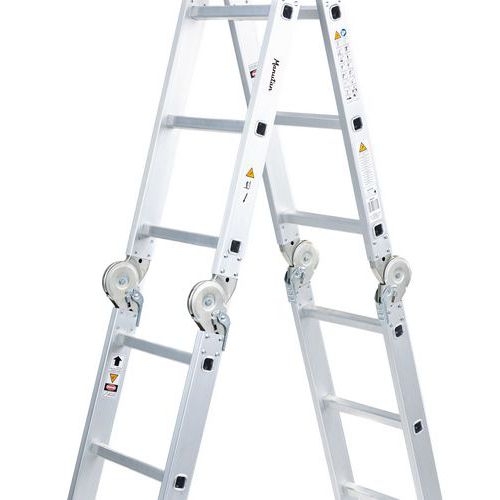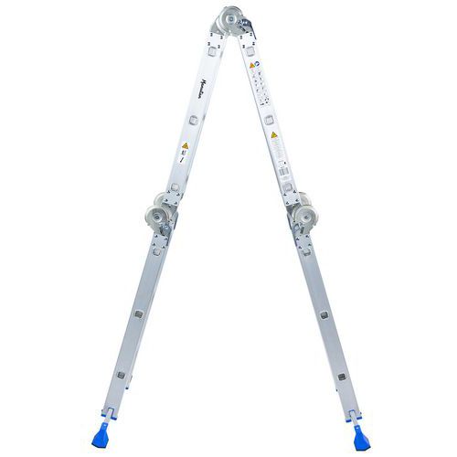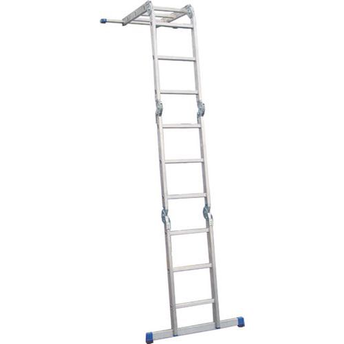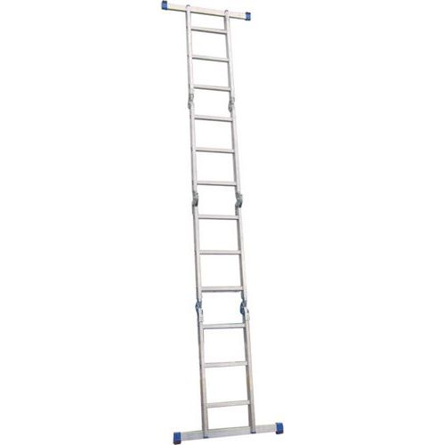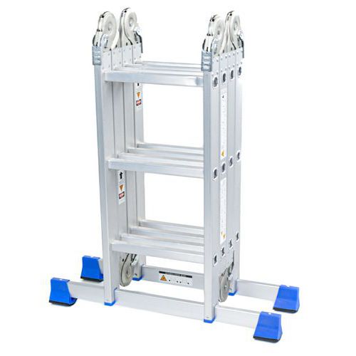 - Kloubový hliníkový žebřík ze čtyř dílů po třech příčkách, vhodný pro profesionální použití.