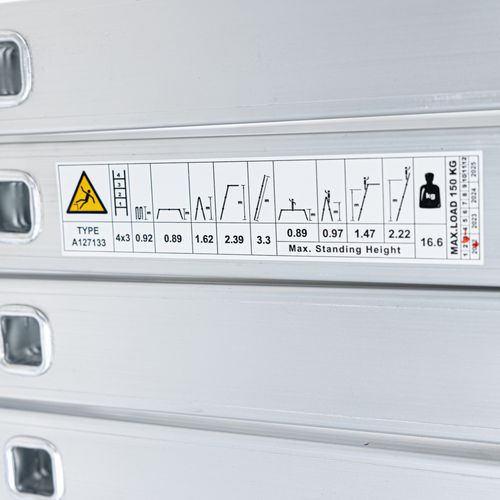 - Pracovní výška - lešení 2,8 m, štafle 2,92 m a opěrný žebřík 4,1 m.