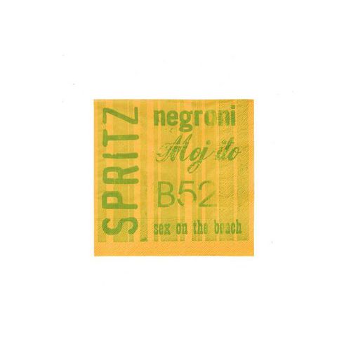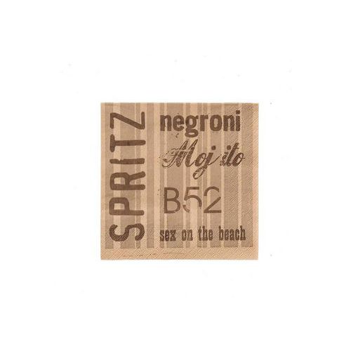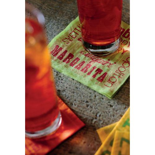 Koktejlové papírové ubrousky Infibra k dispozici 4 barevné varianty s potiskem nejznámějších nápojů jako např. CAPIRIŇA, Teguila, Manhattan, grasshopper, Americano, Bellini, Daiquiri, Cubalibra, Gin fizz, B52, Sex on the beach, Mojito, Bloody Mary a další.Pro vytvoření co nejlepší atmosféry pro váš bar.