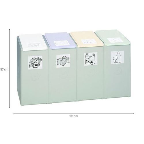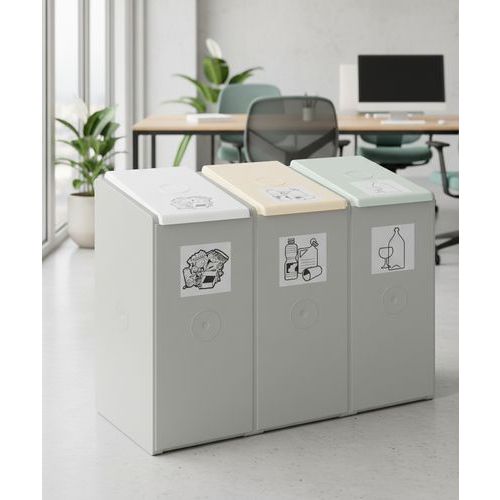 Modulární plastové kontejnery na třídění odpadu. Vyrobené z nárazuvzdorného polyesteru v šedém provedení RAL 7035. Lze zvolit z variant 1, 2, 3 nebo 4 košů. Jednoduché vyprázdnění koše pomocí vnitřní nádoby (není součástí dodání). Možnost doplnění o mobilní podstavu a barevná víka. Dodáváno včetně samolepicích piktogramů pro třídění odpadu.