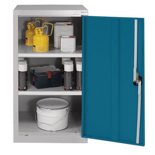 Svařovaná dílenská skříň z ocelového plechu vybavená dvěma policemi. Výška polic nastavitelná v krocích po 25 mm. Uzamykání rozvorovým cylindrickým zámkem. Tiché zavírání dveří díky gumovým zarážkám.