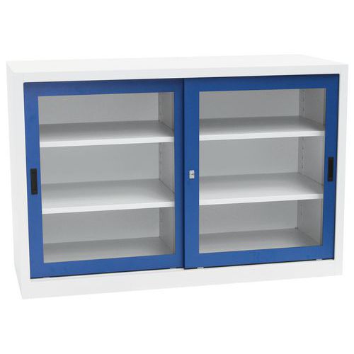 Nízké kovové skříně s prosklenými posuvnými dveřmi jsou vhodné do kanceláří, laboratoří, dílenský pracovišť i zdravotních zařízení. Skříňky s konstrukcí z ocelového plechu je vybavena dvěma policemi, jejichž výšku lze podle potřeby nastavit. Dveře jsou uzamykatelné cylindrickým zámkem.