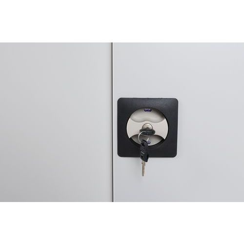 - Plechové skříně je možné uzamknout cylindrickým dvoubodovým rozvorovým zámkem.