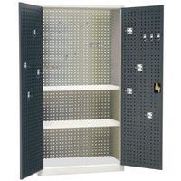 - Zadní část kovových skříní i dveře jsou opatřeny perforovanými panely pro uchycení držáků nářadí a boxů.