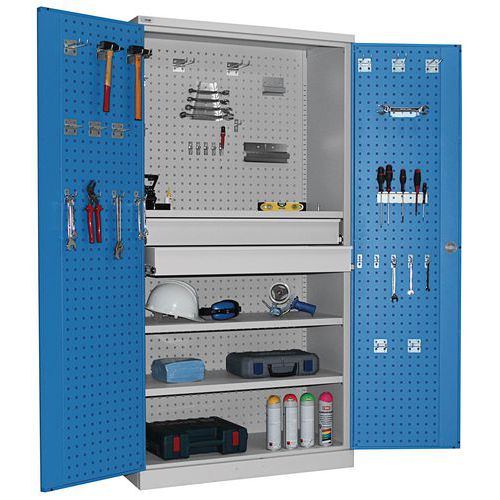 Svařovaná dílenská skříň s plně výsuvnými zásuvkami a perforacemi pro uchycení nářadí. Dveře a zadní strana jsou perforované pro háčky na nářadí (čtvercové otvory 10 x 10 mm, rozteč 38 mm). Uzamykání dvoubodovým rozvorovým cylindrickým zámkem. Skříň lze připevnit k zemi a ke zdi pomocí montážních otvorů.