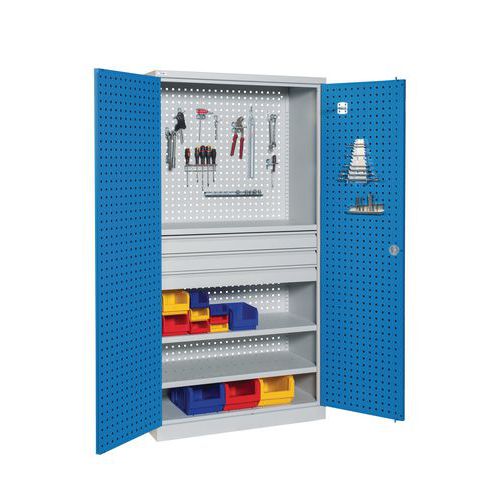 Svařovaná dílenská skříň s plně výsuvnými zásuvkami a perforacemi pro uchycení nářadí. Dveře a zadní strana jsou perforované pro háčky na nářadí (čtvercové otvory 10 x 10 mm, rozteč 38 mm). Uzamykání dvoubodovým rozvorovým cylindrickým zámkem. Skříň lze připevnit k zemi a ke zdi pomocí montážních otvorů.