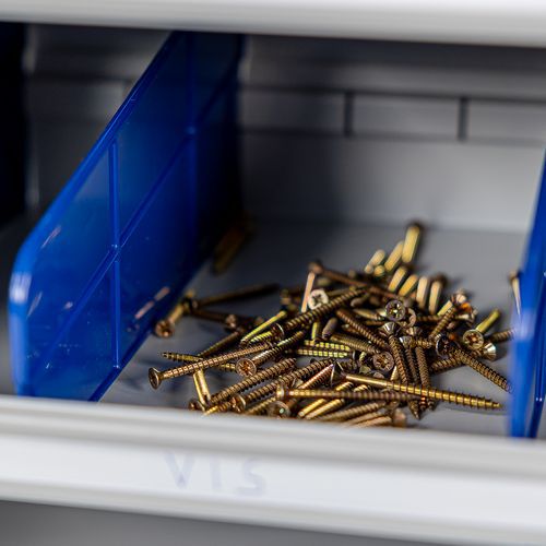 Součástí jsou plastové děliče, které lze přemisťovat po 50 mm a police stavitelné v rastru 30 mm.
