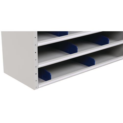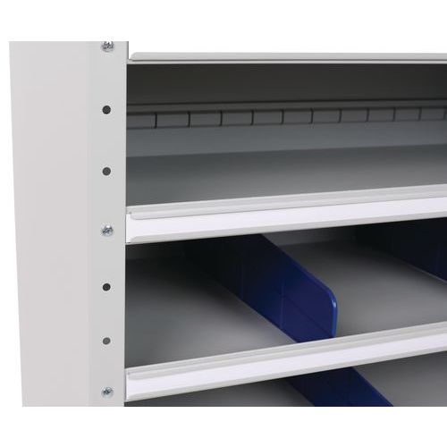 Součástí jsou plastové děliče, které lze přemisťovat po 50 mm a police stavitelné v rastru 30 mm.