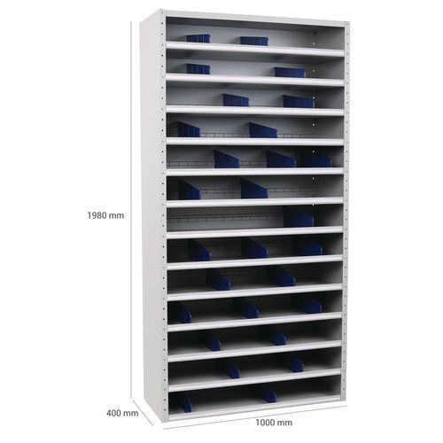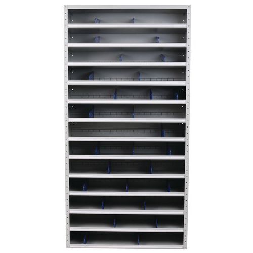Kovový regál s děliči Manutan Expert, 198 x 100 x 40 cm, 12 polic, šedý