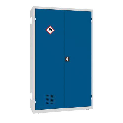 - Křídlové dveře mají větrací otvory pro cirkulaci vzduchu a jsou opatřené štítkem GHS-02 pro standardní identifikaci chemického nebezpečí.