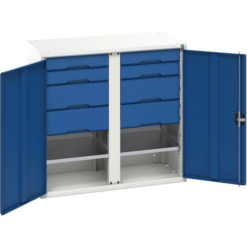 Kovová skříň pro údržbu Bott Verso, 100 x 105 x 55 cm, 2 police, 8 zásuvek, šedá-modrá