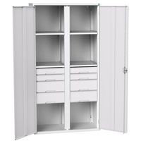 Kovové skříně pro specifické použití v provozech - podle typu vybaveny policemi, zásuvkami, středovou přepážkou nebo i tyčí na ramínka. Pozinkované police s nosnsostí 75 kg, výškově nastavitelné v rastru 25 mm. Zásuvky s nosností 75 kg a 100% výsuvem na válečkových ložiskách. Svařovaná ocelová konstrukce, povrchová úprava práškovým lakem. Vyztužené křídlové dveře s tříbodovým cylindrickým rozvorovým zámkem se dvěma klíči. Bezpečnostní pokyny: - nábytek instalujte na rovnou plochu - upevněte jej na stěnu nebo příčku vhodným upevněním - dbejte na to, abyste nepřekročili maximální doporučené zatížení a také na jeho dobré rozložení
