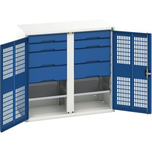 Kovová skříň pro údržbu Bott Verso, drátěné dveře, 100 x 105 x 55 cm, 2 police, 8 zásuvek, šedá-modrá