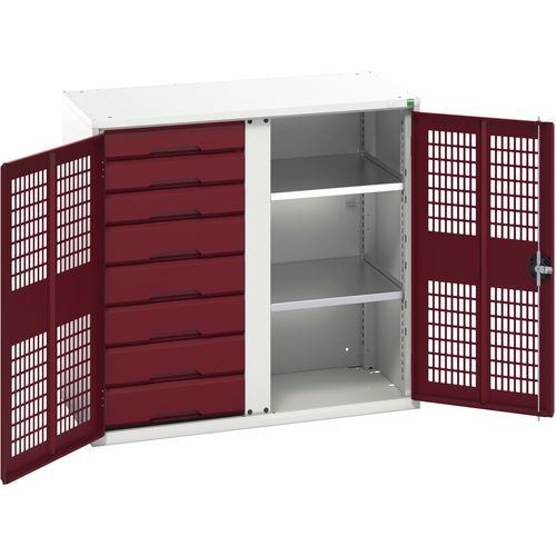 Kovová skříň pro údržbu Bott Verso, drátěné dveře, 100 x 105 x 55 cm, 2 police, 8 zásuvek, šedá-červená