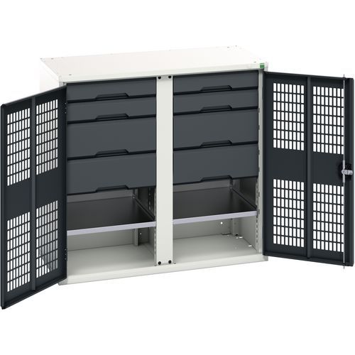 Kovová skříň pro údržbu Bott Verso, drátěné dveře, 100 x 105 x 55 cm, 2 police, 8 zásuvek, šedá-antracit