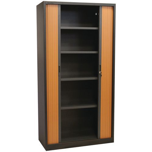 Kovová spisová skříň s roletou Manutan Expert, 4 police, 195 x 100 x 45 cm, antracit/třešeň