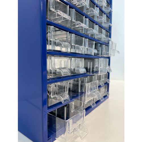 - Kovový zásobník se zásuvkami slouží k přehlednému skladování drobných předmětů a součástek.