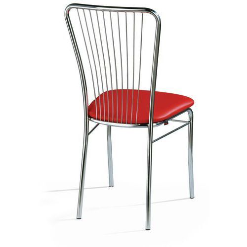 Stylová jídelní židle sestavená z pohodlného sedáku z kvalitní syntetické kůže ve třech barevných variantách a zpevněnou ocelovou konstrukcí. Zaručuje dlouhodobý estetický vzhled, který je dosažen povrchovou úpravou chromem a snadné uskladnění díky stohovatelnosti židlí. Prodej po balení. Nosnost této designové židle do 110 kg.