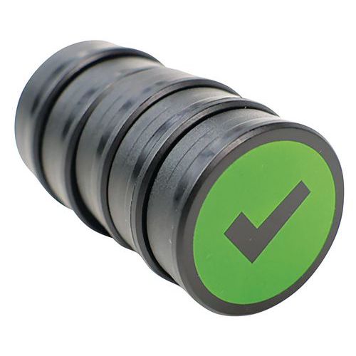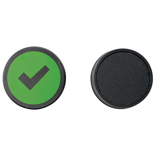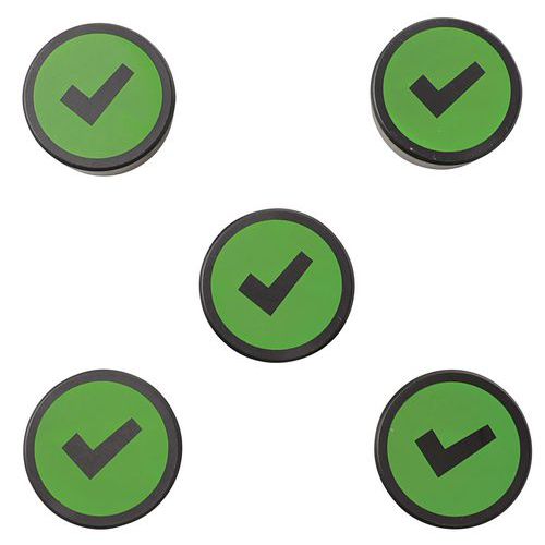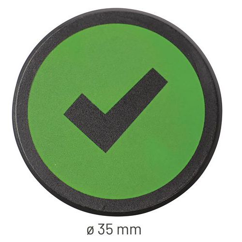 - Kulatý magnet se symbolem háčku nebo fajfky, znázorňující např. správné řešení nebo splněný úkol.