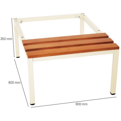 - Lavice s ocelovou konstrukcí a dřevěnou sedací plochou se umisťují pod kovové šatní skříně.