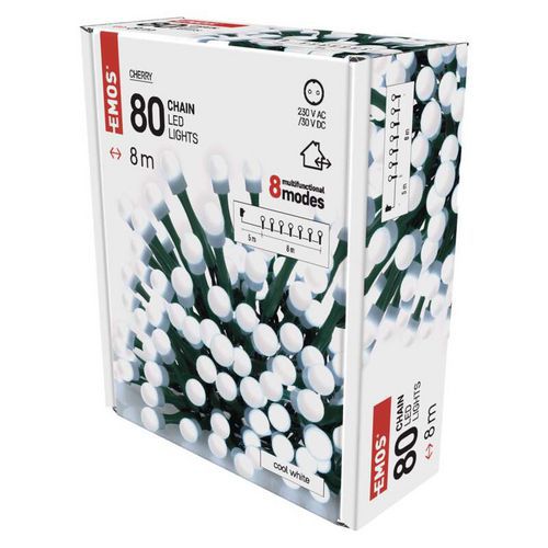 LED vánoční cherry řetěz - kuličky, 8 m, venkovní i vnitřní, studená bílá, programy