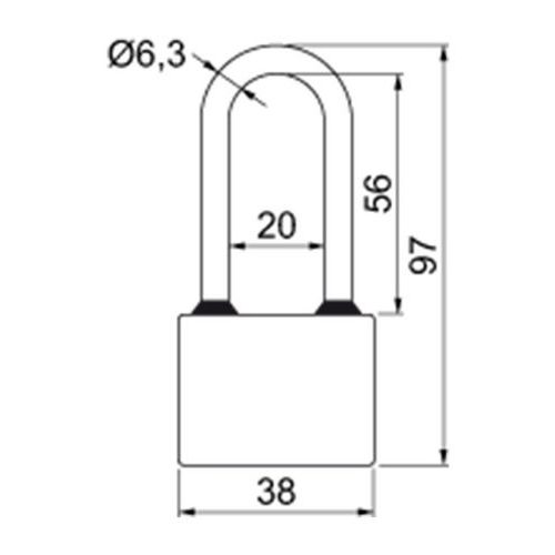 Litinový visací zámek s prodloženým třmenem, průměr třmene 6,3 mm, výška 62,5 mm, SU6