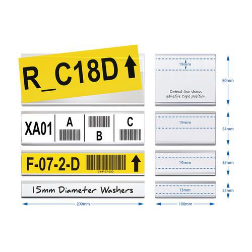 Samolepicí držáky etiket jsou dodávány společně s průhledným štítkem se samolepicí zadní stranou a bílou vkládací kartičkou. Držáky na štítky slouží pro rychlou a jednoduchou orientaci v uličkách a poličkách regálů. Čtení bar kódů je možné bez vytažení štítku. Vyrobeno ve UK