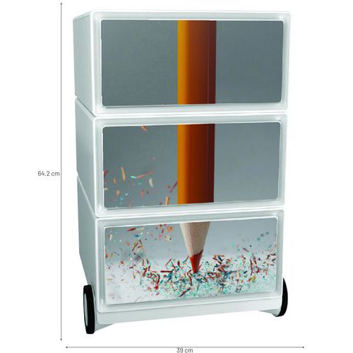 Pojízdné kontejnery se třemi zásuvkami pro ukládání kancelářských pomůcek. Přední plocha zásuvek z ABS plastu. Pojízdnost zajišťují 4 kolečka, z nichž dvě jsou otočná. Užitné rozměry zásuvky jsou 32,5 x 13,3 x 40,5 cm.