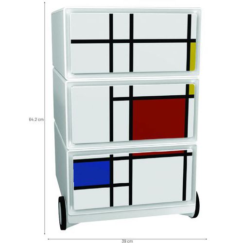 Pojízdné kontejnery se třemi zásuvkami pro ukládání kancelářských pomůcek. Přední plocha zásuvek z ABS plastu. Pojízdnost zajišťují 4 kolečka, z nichž dvě jsou otočná. Užitné rozměry zásuvky jsou 32,5 x 13,3 x 40,5 cm.