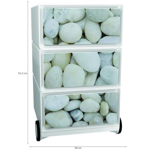 Pojízdné kontejnery se třemi zásuvkami pro ukládání kancelářských pomůcek. Přední plocha zásuvek z ABS plastu. Pojízdnost zajišťují 4 kolečka, z nichž dvě jsou otočná. Užitné rozměry zásuvky jsou 32,5 x 13,3 x 40,5 cm.