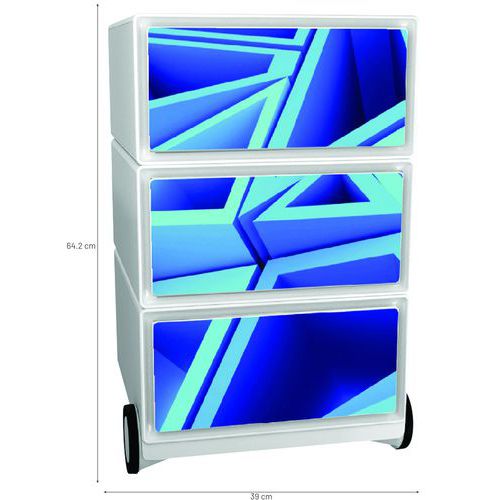 Pojízdné kontejnery se třemi zásuvkami pro ukládání kancelářských pomůcek. Přední plocha zásuvek z ABS plastu. Pojízdnost zajišťují 4 kolečka, z nichž dvě jsou otočná. Užitné rozměry zásuvky jsou 32,5 x 13,3 x 40,5 cm.