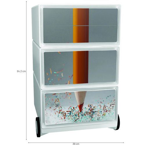 Mobilní designové kontejnery se čtyřmi zásuvkami pro ukládání kancelářských pomůcek. Přední plocha zásuvek z ABS plastu s foto vzorem. Pojízdnost zajišťují 4 kolečka, z nichž dvě jsou otočná. Užitné rozměry zásuvky jsou 32,5 x 13,3 x 40,5 cm.