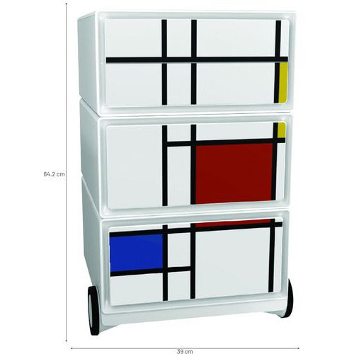 Mobilní designové kontejnery se čtyřmi zásuvkami pro ukládání kancelářských pomůcek. Přední plocha zásuvek z ABS plastu s foto vzorem. Pojízdnost zajišťují 4 kolečka, z nichž dvě jsou otočná. Užitné rozměry zásuvky jsou 32,5 x 13,3 x 40,5 cm.