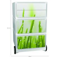 Mobilní designové kontejnery se čtyřmi zásuvkami pro ukládání kancelářských pomůcek. Přední plocha zásuvek z ABS plastu s foto vzorem. Pojízdnost zajišťují 4 kolečka, z nichž dvě jsou otočná. Užitné rozměry zásuvky jsou 32,5 x 13,3 x 40,5 cm.